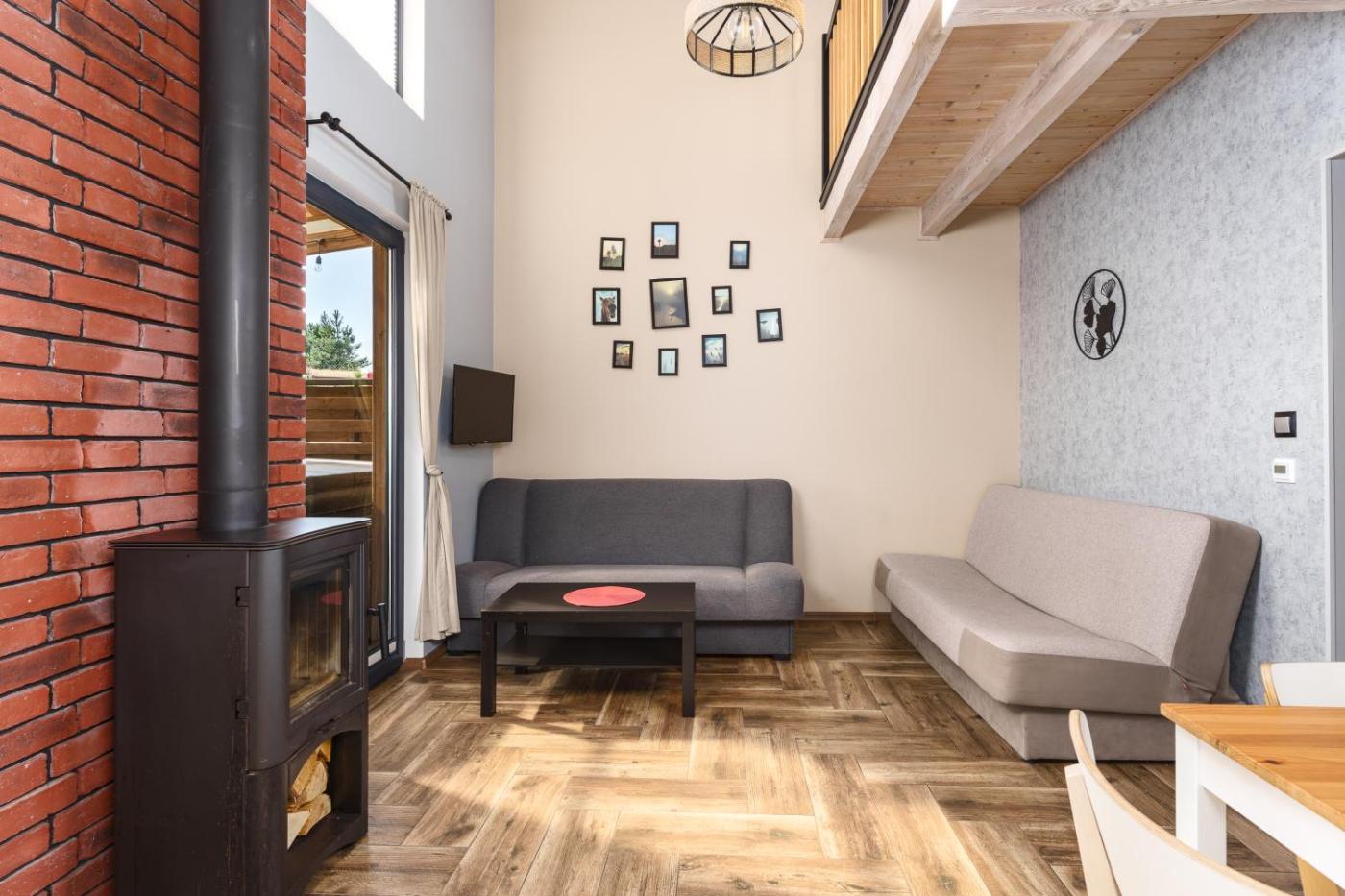 Dom z 1 sypialnią. This holiday homes standout features are the hot tub, sauna and fireplace. Boasting a private entrance, this air-conditioned holiday home includes 1 living room, 1 separate bedroom and 1 bathroom with a shower. The holiday homes kitchenette, which has a refrigerator and kitchenware, is available for cooking and storing food. Featuring a terrace with garden views, this holiday home also offers an electric kettle and a flat-screen TV. The unit has 2 beds. Dom wakacyjny - 4 osobowy. Powierzchnia pokoju ok.: 55 mkw.